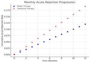 Acute rejection rate: 12% in the newer therapy group vs. 19% in the traditional therapy group during the first year post-transplant.