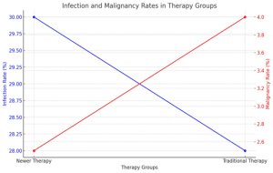 Conversely, the lower incidence of malignancies, particularly post-transplant lymphoproliferative disorders (PTLD), in the newer therapy group is a positive outcome. Traditional immunosuppressive agents, particularly CNIs, have been implicated in an increased risk of malignancies due to their broad immune suppression and propensity to promote oncogenic viral activation. The results support the growing body of literature suggesting that mTOR inhibitors and certain biologics may reduce the incidence of malignancies, potentially due to their more targeted action on immune pathways.