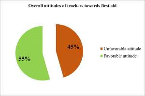 This study revealed that 55.5% of secondary school teachers had a favourable attitude towards first aid. This finding was lower than studies conducted in Debre tabor, Ethiopia (75%)[18], Addis Ababa, Ethiopia (75%)[19], and Saudi Arabia (67%)[20]. These variations might be due to the scope of teachers’ academic performance and school settings. The previous studies were conducted only in urban areas; on the other hand, our study included schoolteachers who worked in rural areas.