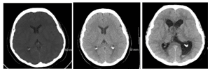 Figure 1: Non-contrast axial CT images of 62 y/o female with intraventricular mass at the anterior aspect of the septum pellucidum covering the foramen of Monro bilaterally and extended to the body of the corpus callosum