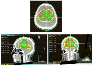 Radiation therapy consisting of 6000 cGy was administered concurrently with this chemotherapy. Since her disease was a rare intraventricular site, inclusion of the cerebrospinal fluid (CSF), similar to the approach for carcinomatous meningitis, became a consideration. This was used for the initial approach after an extensive literature search and discussion with experts. Treatment began with a 2-field approach to the whole brain and upper cervical spine to C2, to 3600 cGy. Then, a 10-intensity modulated radiation therapy (IMRT) arrangement was used to complete the 6000 cGy (Figure 4). Before treatment, each day, image-guided radiation therapy (IGRT) cone beam analysis was used to ensure precise treatment setup.