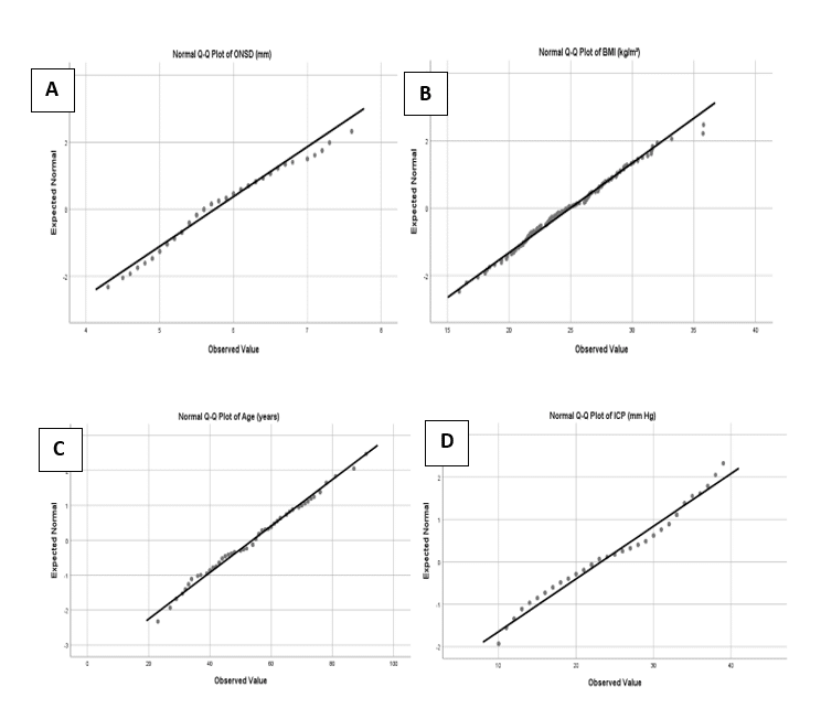 A total of 149 adults were recruited for this study. The survey data indicates that 66.4% (99) of the population consists of females, while 33.6% (50) are males. Figure 1 (Chart A-D) shows the normal distribution of data for ONSD, BMI, Age, and ICP, respectively. The correlation was tested using Pearson’s correlation statistics between ONSD, ICP, and BMI. There was a statistically significant strong positive relationship between ONSD and ICP (r = 0.8, p = 0.00) as shown in Fig. 2. However, no significant relationship seems to exist between ONSD and BMI (r = – 0.005, p = 0.95) as shown in Fig. 3. The study compared the average values for ONSD, ICP, and BMI between male and female populations using a paired sample T-test, with a significance level (p-value) set at 0.05. The findings revealed that there were no statistically significant differences between the average values for males and females for ONSD (p-value = 0.57), ICP (p-value = 0.23), and BMI (p-value = 0.78).