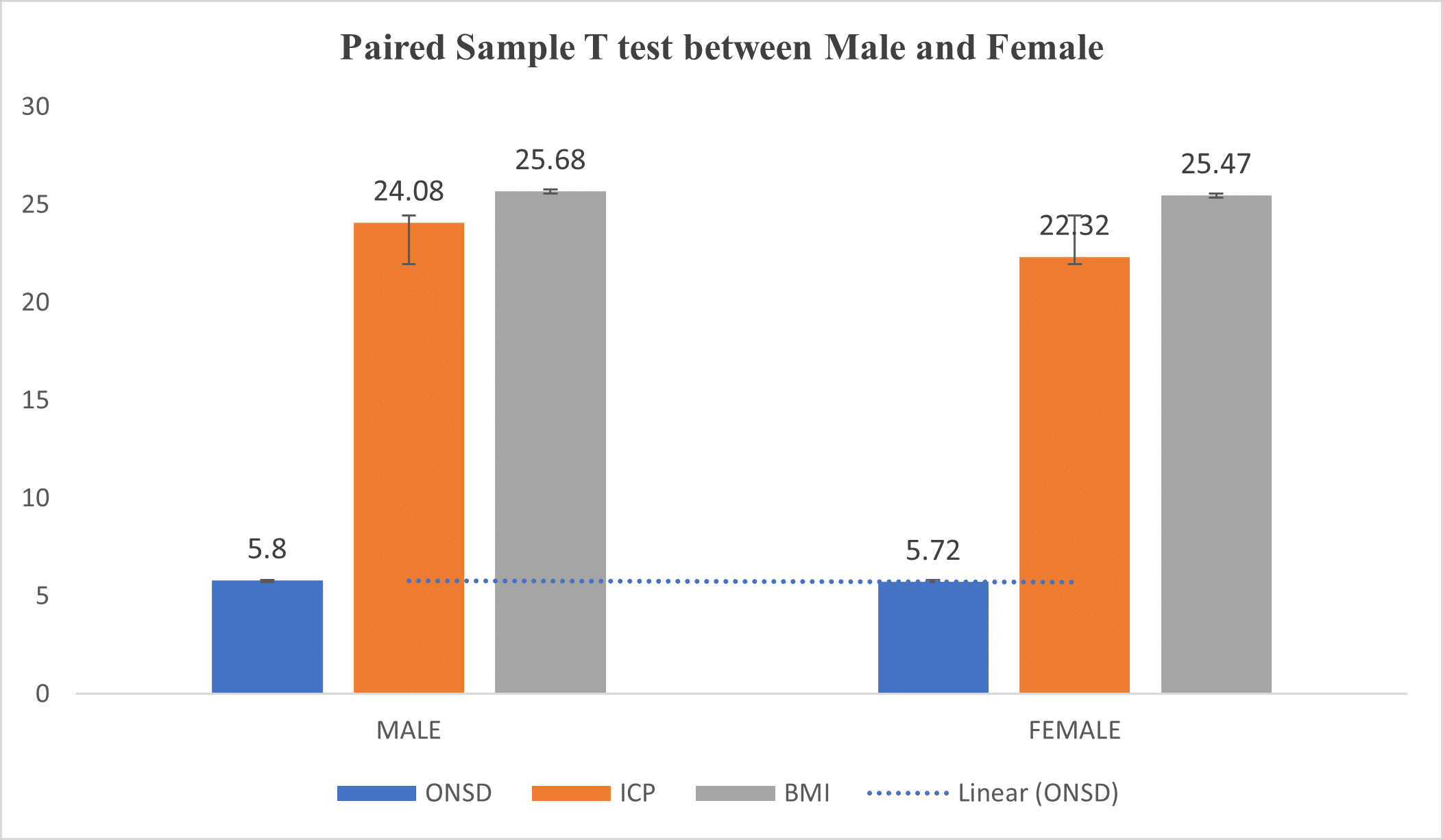 Table 3 above shows no statistically significant differences between average means of ONSD, BMI, and ICP measurements for males and females.