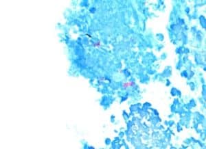 Figure 5: AFB stain shows focal area with aggregated pink rods showing AFB (10x, scale bar 500 lm)