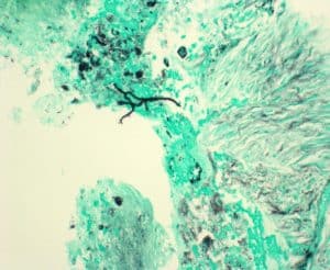 Figure 6: GMS stain for fungi shows a single small aggregate of rare fungal hyphae (20x, scale bar 500 lm)