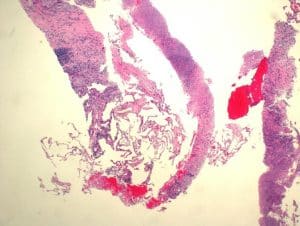 Figure 4: Extensive necrosis with no residual epithelium in this field. (5x, scale bar 500 lm)