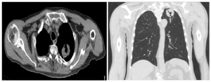 b) T2-weighted coronal image with a large mass lesion with central cavitation in the posterior left lung apex