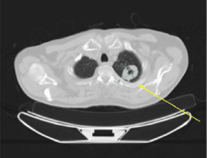 A 67-year-old immunocompetent male with a past medical history significant for hypertension (on lisinopril 20 mg daily), controlled type 2 diabetes (on sitagliptin 100 mg daily, glipizide 10 mg twice a day, and Jardiance 12.5 mg-metformin 1000 mg combination pill twice a day), chronic obstructive pulmonary disease (COPD) (on albuterol, fluticasone propionate-salmeterol and tiotropium inhalers), and tobacco use disorder with a 30-pack year smoking history presented for a routine physical exam. Review of systems was within normal limits. On physical examination, his lungs were clear to auscultation and percussion without any wheezing or gallops. He did not have any remarkable head, ear, nose, throat, cardiac, gastrointestinal, neurological, or musculoskeletal findings. He had a low-dose chest CT performed for the purposes of lung cancer screening, which was significant for a large mass lesion with central cavitation in the posterior left lung apex measuring 4.5 cm, increased in size from previous, with mild adjacent surrounding inflammatory bronchiolitis also in the left lung apex.