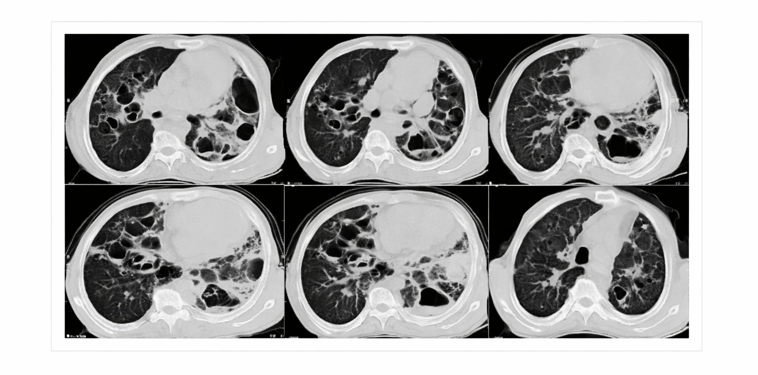 Figure 4: Chest computer tomography (CT) scan on admission showed multiple and large pneumatoceles, some with air‐fluid level consistent with superinfection mainly at middle and lower lung fields, mild consolidation, bronchiectasis, and left pleural thickening