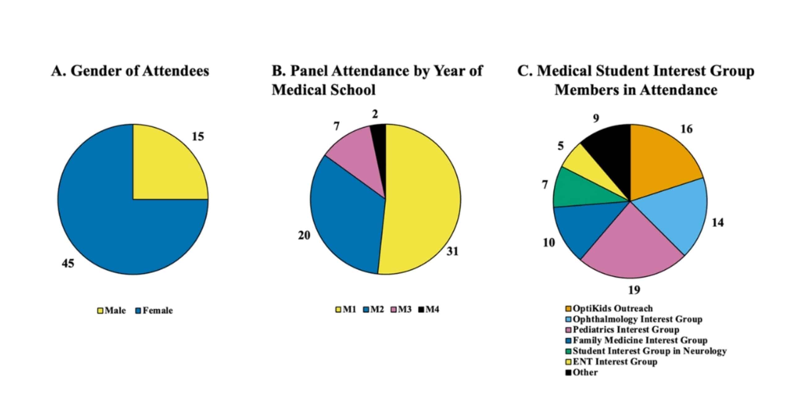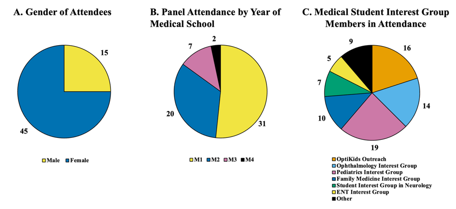 A) Distribution of attendees by year in medical school. B) Medical student interest group affiliations; participants could select multiple groups. C) Gender distribution of attendees