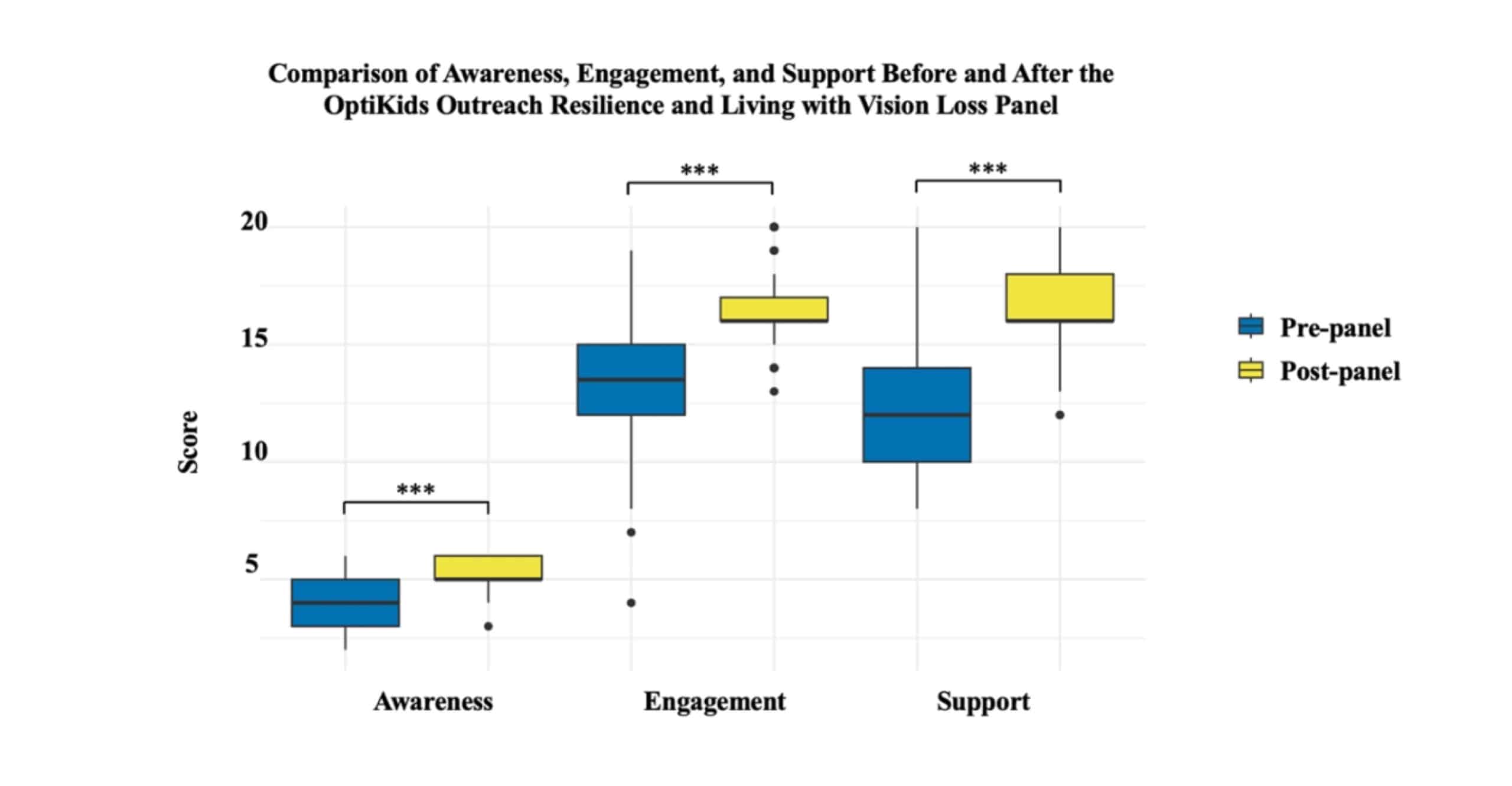 Figure 2: The statistically significant difference in medical students’ (n = 60) perceived awareness, engagement, and support for visually impaired children and their families before the “Resilience and Living with Vision Loss” panel and after the “Resilience and Living with Vision Loss” panel; *** = p < 0.001