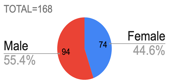 | Female | 4 (50%) | 70 (43.75%) | 74 (44.04%) |