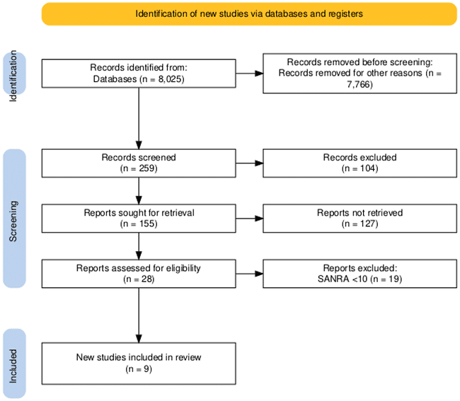 A total of 33,888 articles were found; after applying the inclusion-exclusion criteria, 8,025 references were downloaded from PubMed and Google Scholar. Before the screening process began, 7,766 records were removed for various reasons, leaving 259 records for screening. Out of these, 104 records were excluded based on title and abstract screening. The remaining 155 records were sought for retrieval; however, 127 could not be retrieved, leaving 28 full-text articles for eligibility assessment. These 28 reports were evaluated against predefined criteria, including the SANRA scoring system. Nineteen articles were excluded due to SANRA scores being below 10. Ultimately, 9 studies met all inclusion criteria and were included in the final review.