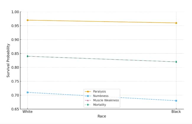 Survival rates for paralysis, numbness, muscle weakness, and mortality by race