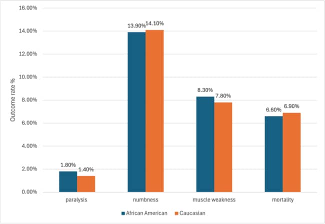 Results: The Black-White patient rates of paralysis (p = 0.163), numbness (p = 0.849), and muscle weakness (p = 0.333) did not reveal statistically significant differences between Black and White patients. Black and white patients did not differ significantly in terms of mortality rates (p = 0.694). Kaplan-Meier analysis also did not demonstrate any difference in time-to-event in any outcome.