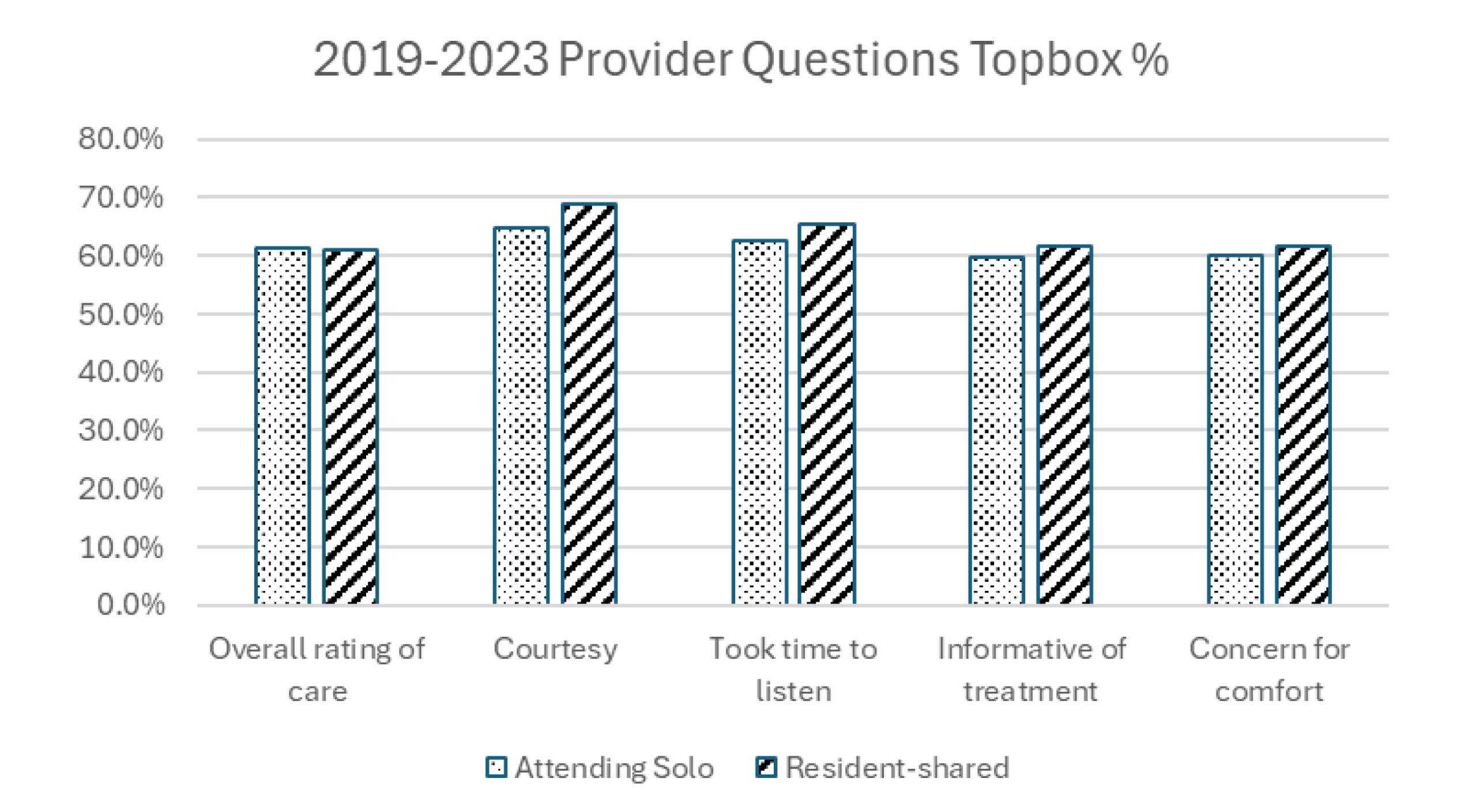 Methodology: This retrospective quasi-experimental study of satisfaction surveys returned to a single community hospital, which occurred between July 2019 and November 2023. The comparison groups were resident-shared versus attending solo visits. Outcomes were percentages of top box score for the “Overall rating of care” and “Doctors” questions. Chi-square and odds ratios statistics were used.