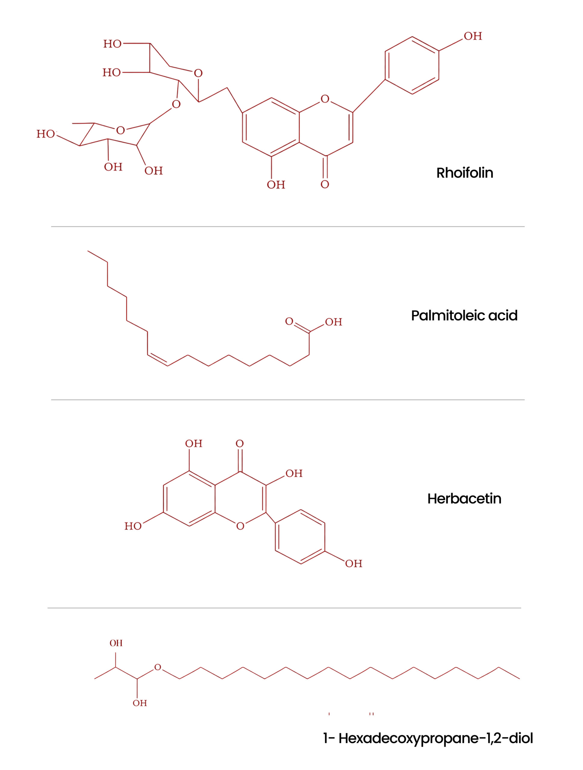 Figure 4: Chemical Structures of 1-Hexadecoxylpropane-1,2-diol, Palmitoleic Acid, Herbacetin, and Rhoifolin
