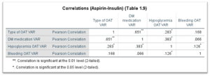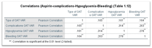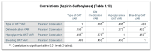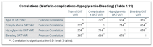 According to the data collected, the antithrombotics used among patients with diabetes are aspirin, warfarin, and DOACs. Out of the individuals who used aspirin or warfarin, 60.8% experienced serious complications, including bleeding and hypoglycemia. In detail, after comparing aspirin and warfarin and reviewing tables 1.11 and 1.12, it became clearer that warfarin had stronger correlations regarding complications than aspirin, with values of PCC of 0.727 and 0.165, respectively.