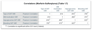 From another perspective, the focus of the study was to investigate the safety of utilizing antithrombotics (aspirin and warfarin) with diabetes medications (insulin, metformin, and sulfonylurea) in terms of their risk of causing bleeding. After reviewing tables 1.5, 1.6, and 1.7, the findings revealed a poor correlation between warfarin and metformin in causing bleeding (PCC is 0.153). Similarly, a weak correlation was observed between warfarin and insulin in causing bleeding (PCC is 0.120). However, a strong correlation was found between warfarin and sulfonylurea in causing bleeding (PCC is 0.755). Caution should be taken when prescribing warfarin and sulfonylurea to patients with diabetes to minimize bleeding risk.