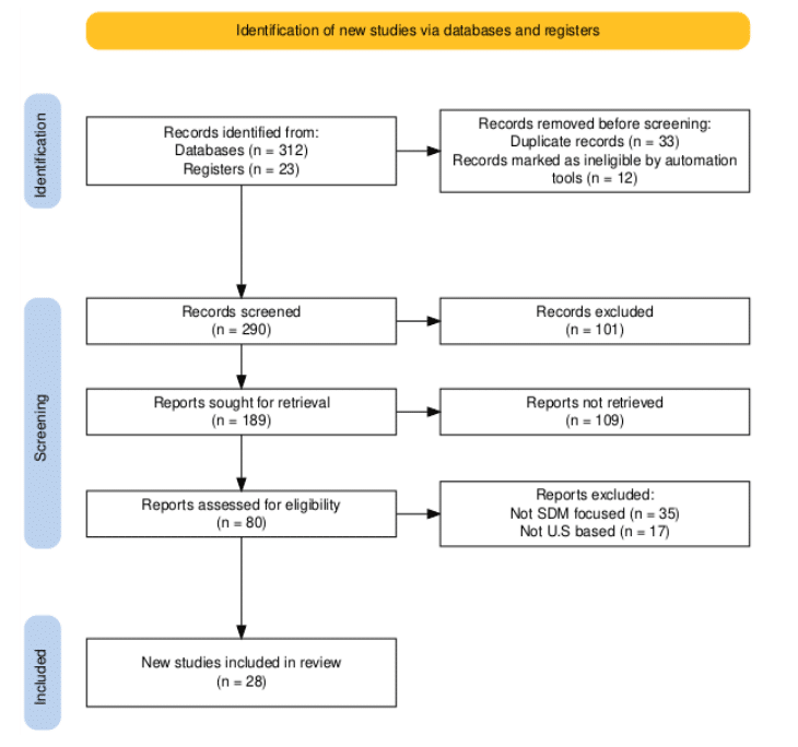 Selection process: The literature selection process adhered to PRISMA guidelines to ensure a transparent and systematic identification of relevant studies. A total of 335 records were initially identified, 312 from electronic databases and 23 from clinical trial registers. After removing 33 duplicate records and 12 ineligible entries filtered by automation tools, 290 records were screened based on titles and abstracts. Of these, 101 were excluded for not meeting basic relevance criteria. The full texts of 189 potentially eligible reports were sought for retrieval; however, 109 could not be accessed due to constraints of institutional access. The remaining 80 full-text articles were assessed for eligibility. After further exclusion of 35 studies that lacked a focus on SDM and 17 that were not U.S.-centric, 28 studies met all inclusion criteria and were incorporated into the final narrative synthesis.