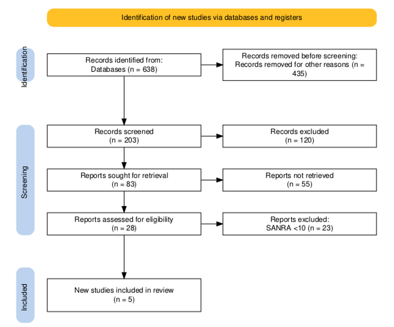 The remaining 83 reports were sought for full-text retrieval. However, 55 reports could not be retrieved due to access limitations or unavailability of full-text versions. Consequently, 28 full-text articles were assessed for eligibility against detailed inclusion and exclusion criteria. A quality appraisal was performed using the Scale for the Assessment of Narrative Review Articles (SANRA) tool, where articles scoring less than 10 were excluded. As a result, 23 reports were excluded based on their SANRA score.