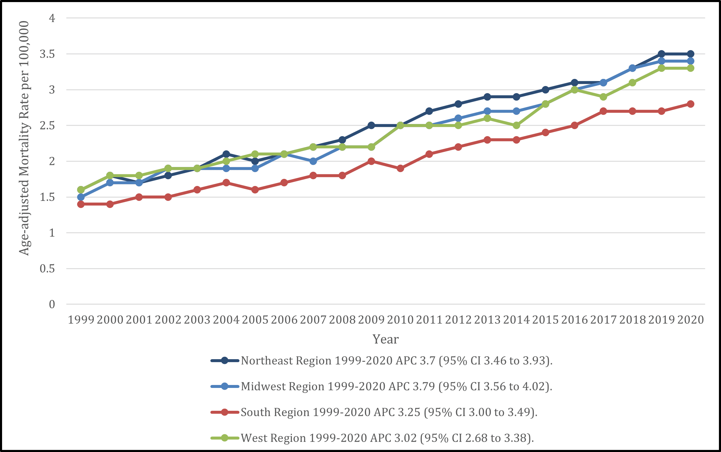IHCC-associated mortality stratifies by geography: Regional differences were also seen. The Northeast had the highest IHCC-related mortality, with an average AAMR of 2.6, increasing from 1.6 in 1999 to 3.5 in 2020 (APC 3.70%, 95% CI, 3.46 to 3.93). The Midwest had an AAMR of 2.5 (1.5 in 1999 to 3.4 in 2020; APC 3.79%, 95% CI, 3.56 to 4.02), and the West also had an AAMR of 2.5 (1.6 to 3.3; APC 3.25%, 95% CI, 3.00 to 3.49). The South had the lowest mortality with an average AAMR of 2.1, increasing from 1.4 to 2.8 (APC 3.02%, 95% CI, 2.68 to 3.38) (Figure 3).