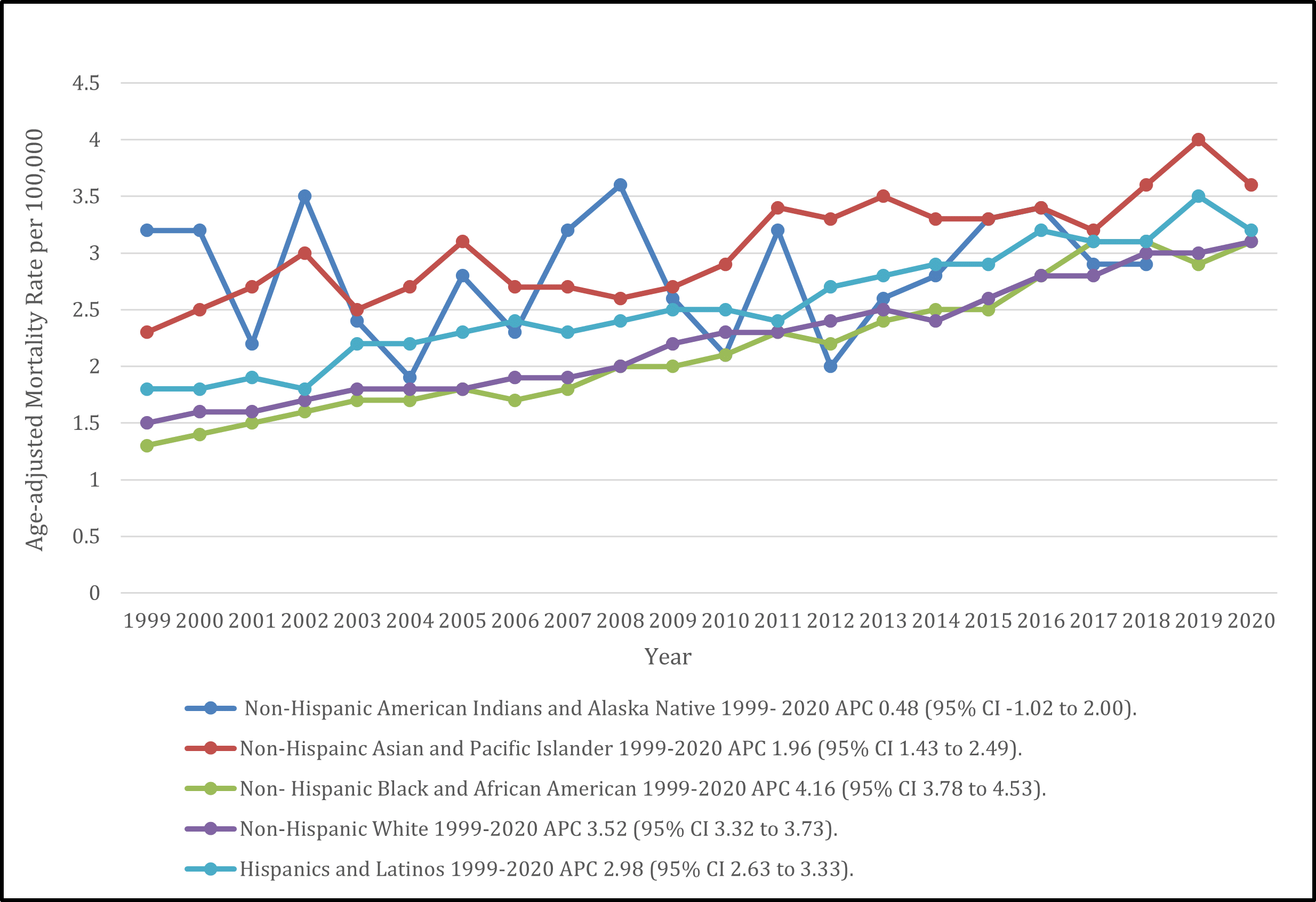 Figure 2: Race-stratified IHCC-related AAMR per 100,000 adults in the United States, 1999-2020
