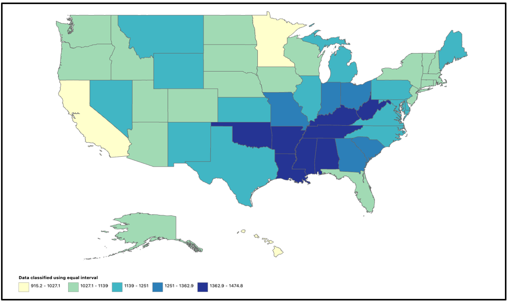 Figure 4: States stratified age-adjusted mortality rate per 100,000 adults in the United States, 1999-2020
