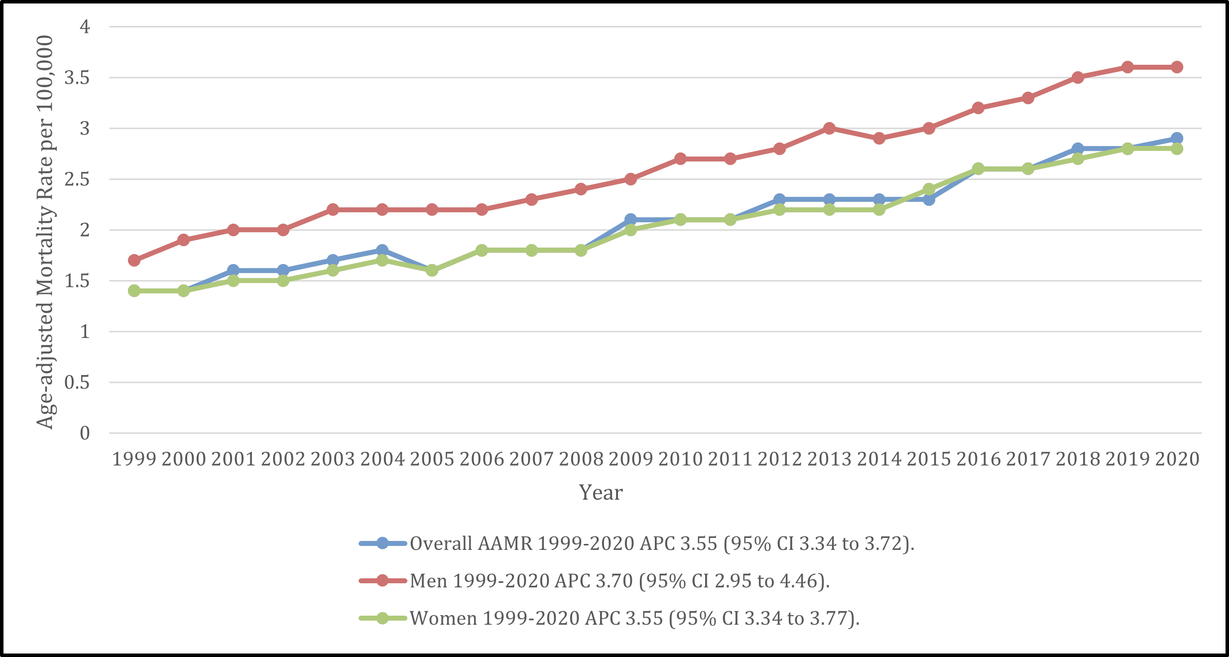 Figure 1: Year and gender stratified AAMR per 100,000 adults in the United States from 1999 to 2020