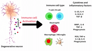 Neuroinflammation plays a vital role in a range of neurodegenerative diseases by causing damage within the CNS. The release of pro-inflammatory cytokines, chemokines, and other inflammatory mediators stimulates the immune cells, resulting in the formation of reactive oxygen species (ROS) and nitric oxide (NO). This ROS and NO cause oxidative stress and neuronal damage, leading to neuroinflammation. Subsequently, neuroinflammation can disrupt the blood-brain barrier (BBB), allowing peripheral immune cells to infiltrate the CNS. This further accelerates the inflammatory response, causing neurodegeneration. Research has shown that a toxic environment is created due to chronic activation of microglia and astrocytes, which leads to continuous loss of neurons and synapses. Thus, neuroinflammation is a driving force in the progression of Alzheimer’s disease, parkinson’s disease, and amyotrophic lateral sclerosis.[8]