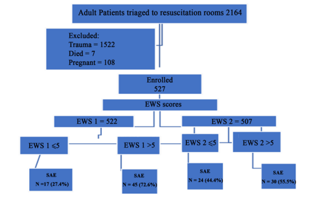 Study protocol: Research assistants were scheduled to collect data in 12-hour shifts, and during that time, all patients who were triaged to resuscitation rooms were enrolled consecutively. Demographics, clinical presentation, records of six vital signs (BP, Pulse rate, Respiratory rate, oxygen saturation, temperature and level of conscious-AVPU) and calculation of early warning score (EWS) at 15 minutes on arrival (EWS1) and after 2 hours (EWS2), all enrolled patient were followed for 24 hours and outcomes were documented using a structured case report form then used to record all participants’ information and entered into a Redcap software program (Research Electronic Data Capture) (RedCap, version 6.0.1, Vanderbilt University Tennessee, USA). All patients were followed up in a hospital ward (if admitted) or through mobile phone calls if discharged to determine their outcome, including mortality, within 24 hours.