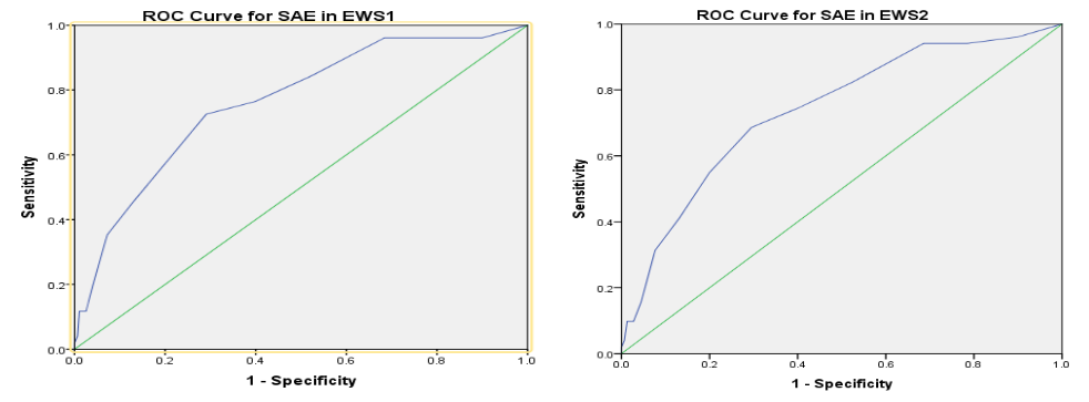 ROC curve performance for EWS: The AUROC-1 for EWS1 for overall SAEs was 0.76 (p-value 0.000, 95% CI 0.69-0.83), with the optimum cut-off point (EWS) score of 5.5, which had a sensitivity of 72.5% and specificity of 70 %. The AUROC -2 for EWS2 for overall SAEs was 0.75 (p-value 0.00, 95% CI 0.68-0.82) with the optimum cut-off (EWS2) score of 4.5 with a sensitivity of 70% and specificity of 72 % (Figures 2).