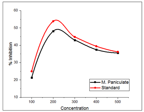 Nitric Oxide (NO) free radical scavenging assay: At physiological pH, sodium nitroprusside creates nitric oxide in an aqueous solution, which then interacts with oxygen to create nitrite ions, which may be seen at 550 nm on a spectrophotometer. Chemicals and reagents: sodium nitroprusside, phosphate buffer, 0.1 % N 1-naphthyl ethylenediamine hydrochloride, and five mM Griess reagent (1 % sulphonyl amide) (pH 7.4). The plant extract was dissolved in methanol for this measurement. Different quantities (100-500 g/ml) of methanol extract were incubated for three hours at 29°C with sodium nitroprusside (5 mM) in standard phosphate buffer saline (0.025 m, pH 7.4). An equivalent amount of buffer was used in a control experiment that was run without the test substances as a blank. After three hours of incubation, the samples were diluted with 1 ml of Griess reagents. At 550 nm on a spectrophotometer, the absorbance of the color formed during the diazotization of nitrite with sulphanilamide and its subsequent coupling with naphthyl ethylenediamine hydrochloride was detected. The same procedure was carried out using ascorbic acid, a standard, as opposed to the methanol extract. A formula was used to determine the % inhibition in contrast to the standard, and a graph was drawn as a result.