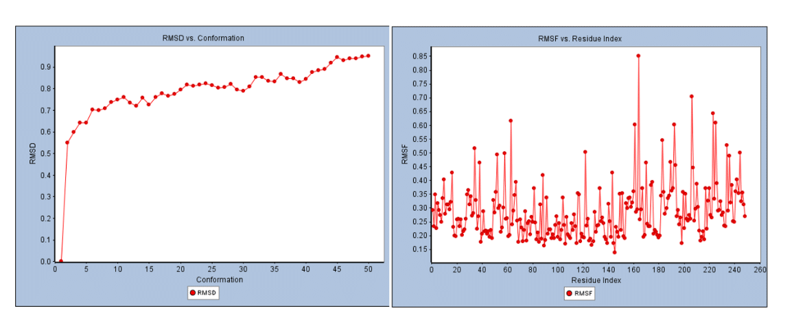 Figure 11: RMSD and RSMF analysis of 3ERT protein with 5,7-Dimethoxy-8-(2-oxo-3-methylbutyl) coumarin