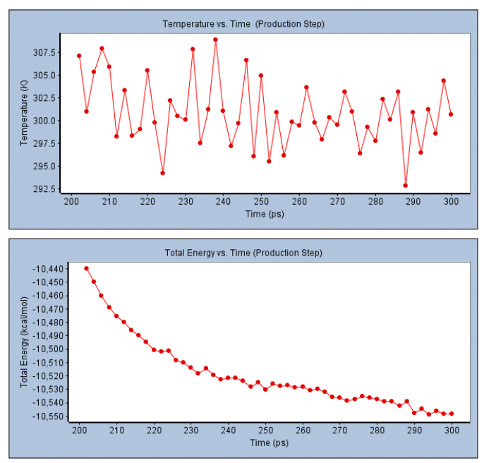 Figure 12: Temperature and total energy analysis of 3ERT protein with 5,7-Dimethoxy-8-(2-oxo-3-methylbutyl) coumarin
