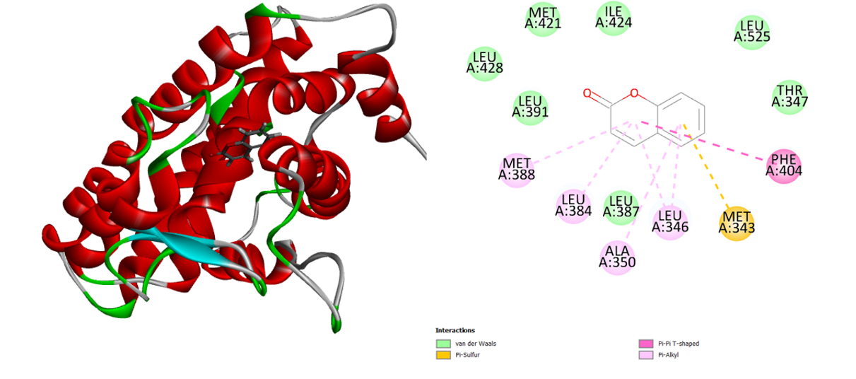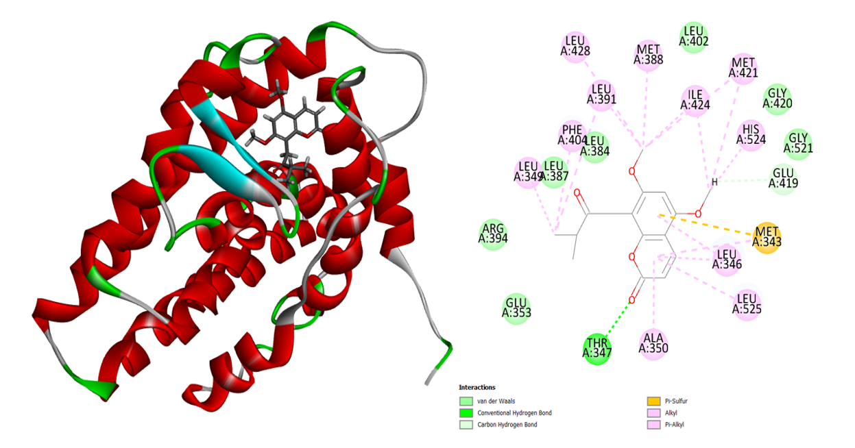 The plant from MP, 5,7-Dimethoxy-8-(2-oxo-3-methylbutyl) coumarin, exhibits a greater binding affinity to the human estrogen receptor. The 5,7-Dimethoxy-8-(2-oxo-3-methylbutyl) coumarin has a binding energy of -35.2403 Kcal/mol. The ketone group of this molecule interacts strongly with the amino acid Thr 347 to produce one H-bond (Figure 3). Most of the aromatic and alkyl groups in the 5,7-Dimethoxy-8-(2-oxo-3-methylbutyl) coumarin molecule engage with the human estrogen receptor’s active site through alkyl and Pi-alkyl interactions. Van der Waals interaction involves the other active site residues.
