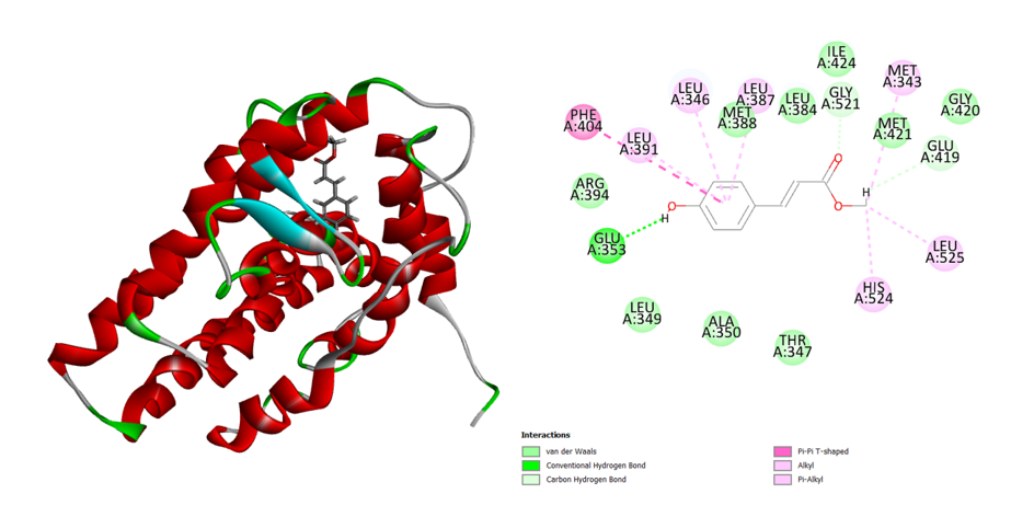 Within the active site, the methyl 4-hydroxycinnamate exhibits excellent binding contact. Methyl 4-hydroxycinnamate’s -OH group interacts with the amino acid Glu 353 to generate a potent H-bond. The Phe 404 amino acid interacts in a Pi-Pi T shape with the aromatic benzene molecule. Leu 525, His 524, and Met 343 amino acids were affected by the other methoxy molecule through alkyl interactions (Figure 4). Van de Waals contact with human estrogen receptors is formed by the amino acids Arg 39, Leu 349, Ala 350, Thr 347, Met 388, Leu 384, Ile 424, Gly 521, and Gly 420. Methyl 4-hydroxycinnamate from MP has a binding energy of -30.3502 Kcal/mol.