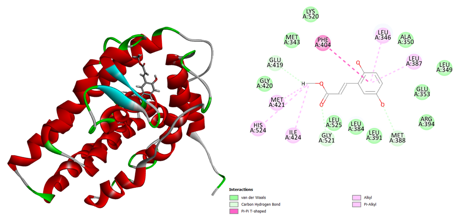 The human estrogen receptor exhibits a similar binding affinity to methyl 2,5-dihydroxycinnamate. One H-bond and other non-bonding interactions improve the binding contact in this molecule docking analysis compared to the typical medication. With the corresponding amino acid, the carboxylic acid creates three alkyl contacts and one H-bond (Figure 5). The phenyl group of the methyl 2,5-dihydroxycinnamate interacts with the Phe 404 amino acid to produce a Pi-Pi T-shaped connection.