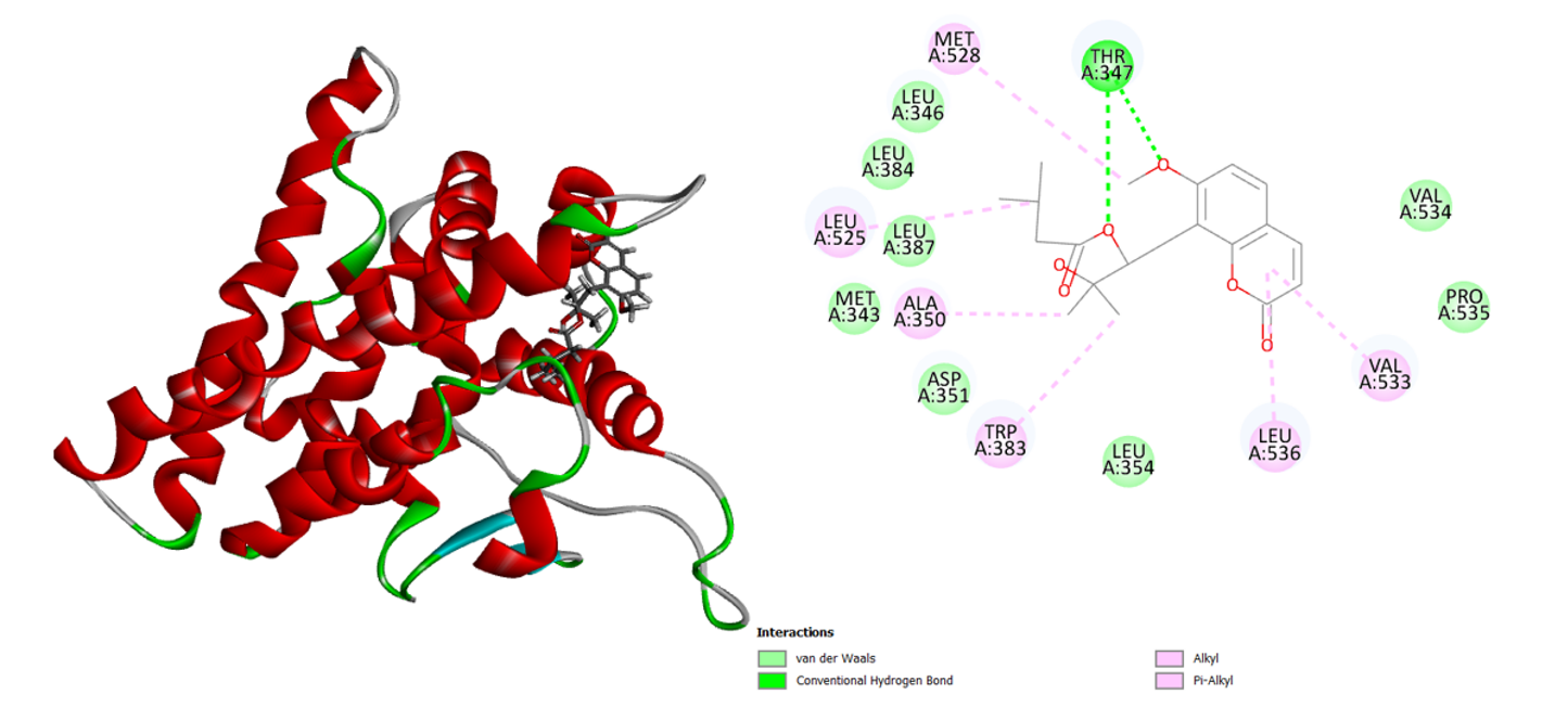 Two robust H-bonds between the murrayatin phytochemical and the amino acid Thr 347 are visible (Figure 6). Most other alkyl and aromatic compounds interact with the amino acids Val 533, Leu 536, Trp 383, Ala 350, Leu 525, and Met 528 to create alkyl and pi-alkyl associations. The murrayatin’s binding energy is -28.8854 Kcal/mol.