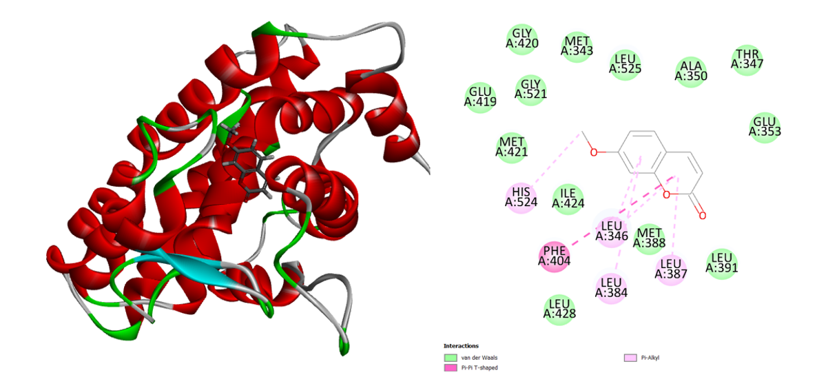 Figure 3: 3D and 2D interaction of the 5,7-Dimethoxy-8-(2-oxo-3-methylbutyl) coumarin in the active site of the human estrogen receptor