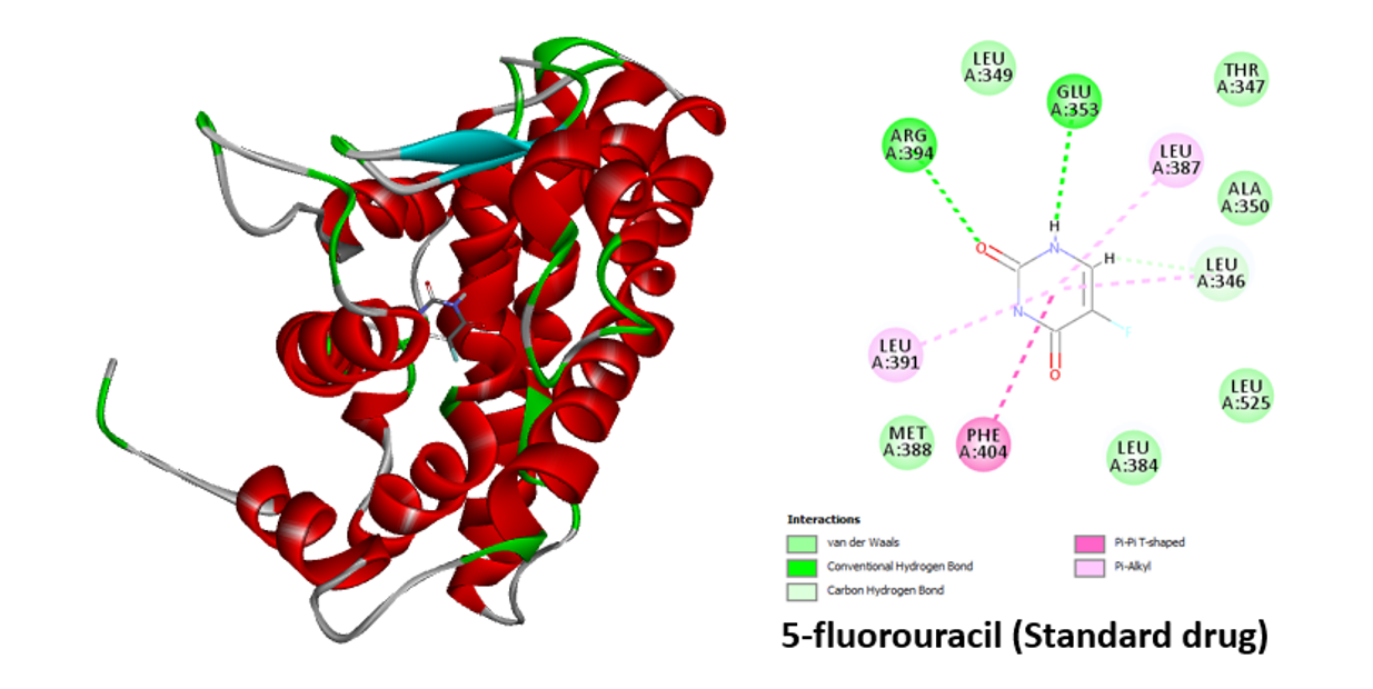 Similar binding interactions between coumarin and the human estrogen receptor are also seen. Van der Waals, Pi-alkyl, Pi-sulfur, and Pi-Pi-T-Shaped interactions were all included in this interaction analysis (Figure 8). Two hydrogen bonds are formed between the amino acids Arg 394 and Glu 353 and the common medication 5-fluorouracil (Figure 9). Compared to most of the ligands, the typical medication exhibits lower binding energy.