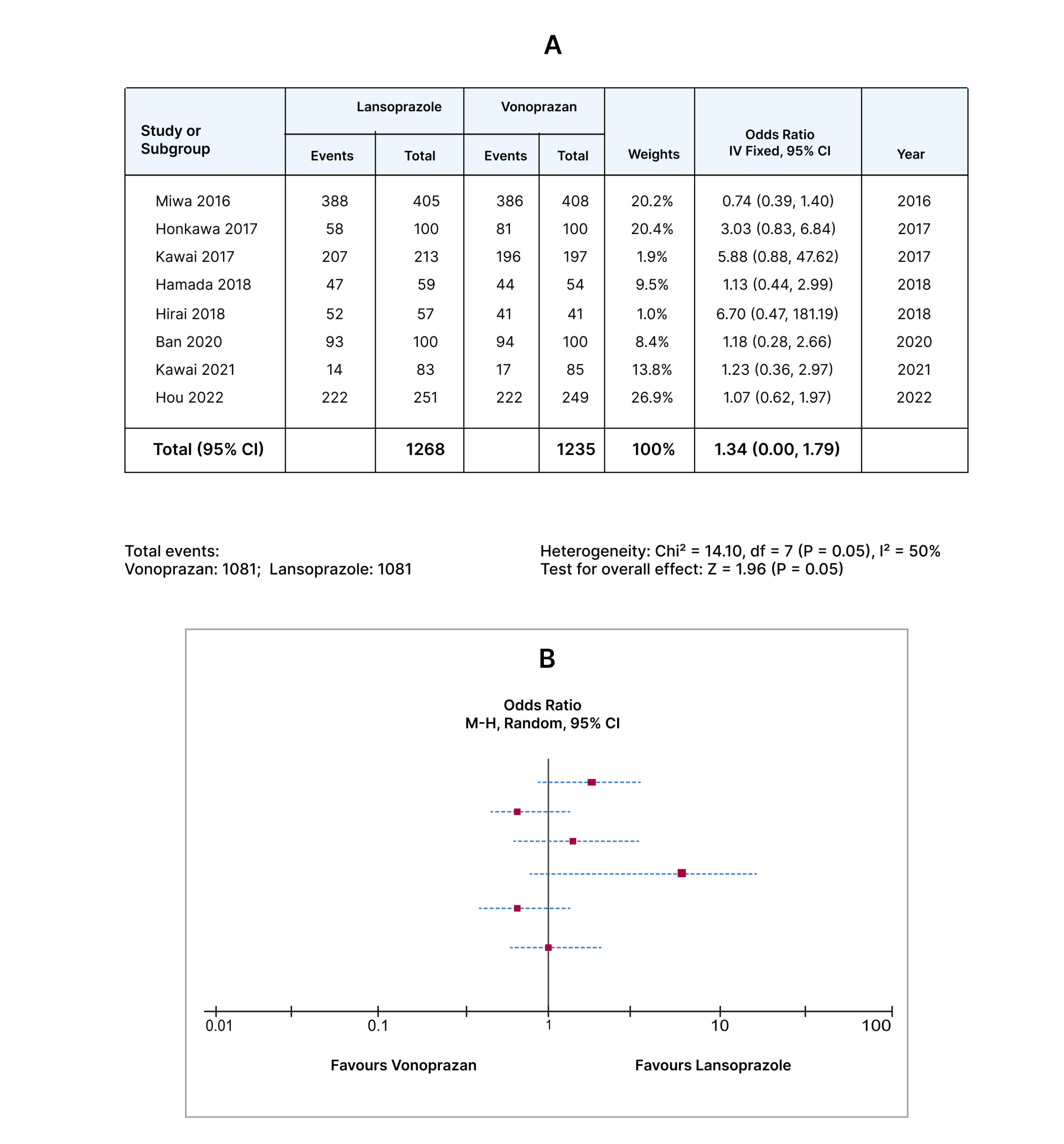 Ulcer healing rate/shrinkage ratio: The pooled odds ratio of Vonoprazan vs Lansoprazole for ulcer healing rate was 1.34 (95% CI,1.00-1.79, I2=50%), which was statistically significant with a p-value of 0.05 as shown in Figure 3.