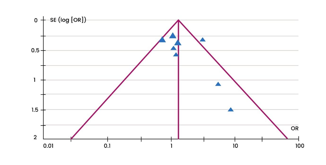 A funnel plot was constructed using Review Manager for assessment of the risk of bias in studies. There was a small publication bias found in the included studies as represented by the funnel plot shown below. The funnel plot shown (Figure 1) is asymmetrical as the studies are not evenly distributed on both sides of the plot.