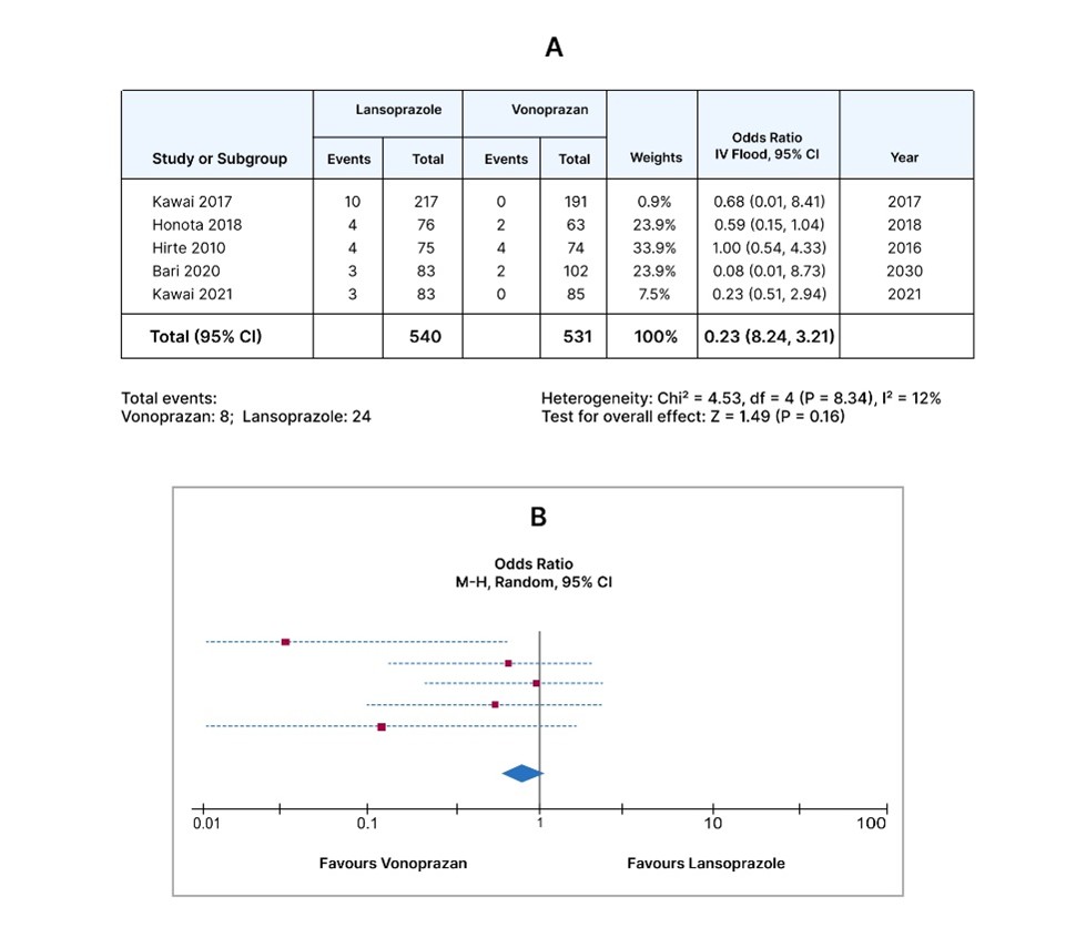 Bleeding control: The pooled odds ratio of Vonoprazan vs Lansoprazole for bleeding control was 0.55 (95% CI, 0.24-1.27, I2=12%), which was insignificant with a p-value of 0.16 as indicated in Figure 4, studies reporting the bleeding control.