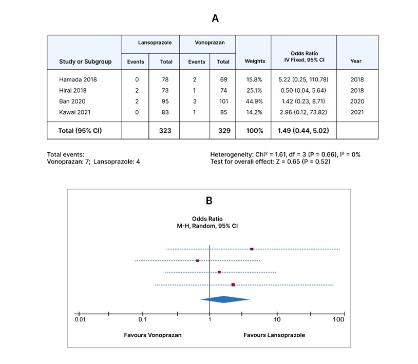 Perforation: The pooled odds ratio of Vonoprazan vs Lansoprazole for Perforation was 1.49 (95% CI, 0.44-5.02, I2=0%,) which was insignificant with a p-value of 0.52 as indicated in Figure 5, studies reporting the perforation.