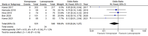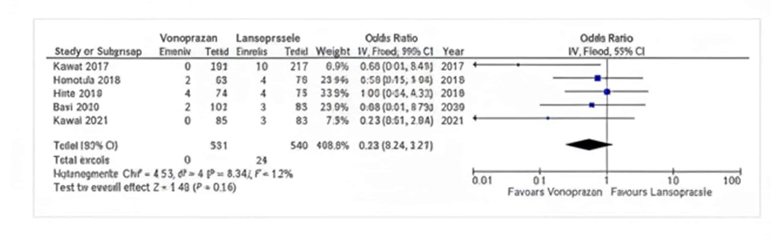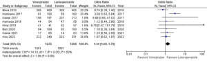 Bleeding control: The pooled odds ratio of Vonoprazan vs Lansoprazole for bleeding control was 0.55 (95% CI, 0.24-1.27, I2=12%), which was insignificant with a p-value of 0.16 as indicated in Figure 4, studies reporting the bleeding control.