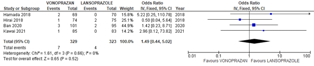 Perforation: The pooled odds ratio of Vonoprazan vs Lansoprazole for Perforation was 1.49 (95% CI, 0.44-5.02, I2=0%,) which was insignificant with a p-value of 0.52 as indicated in Figure 5, studies reporting the perforation.