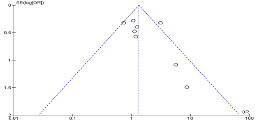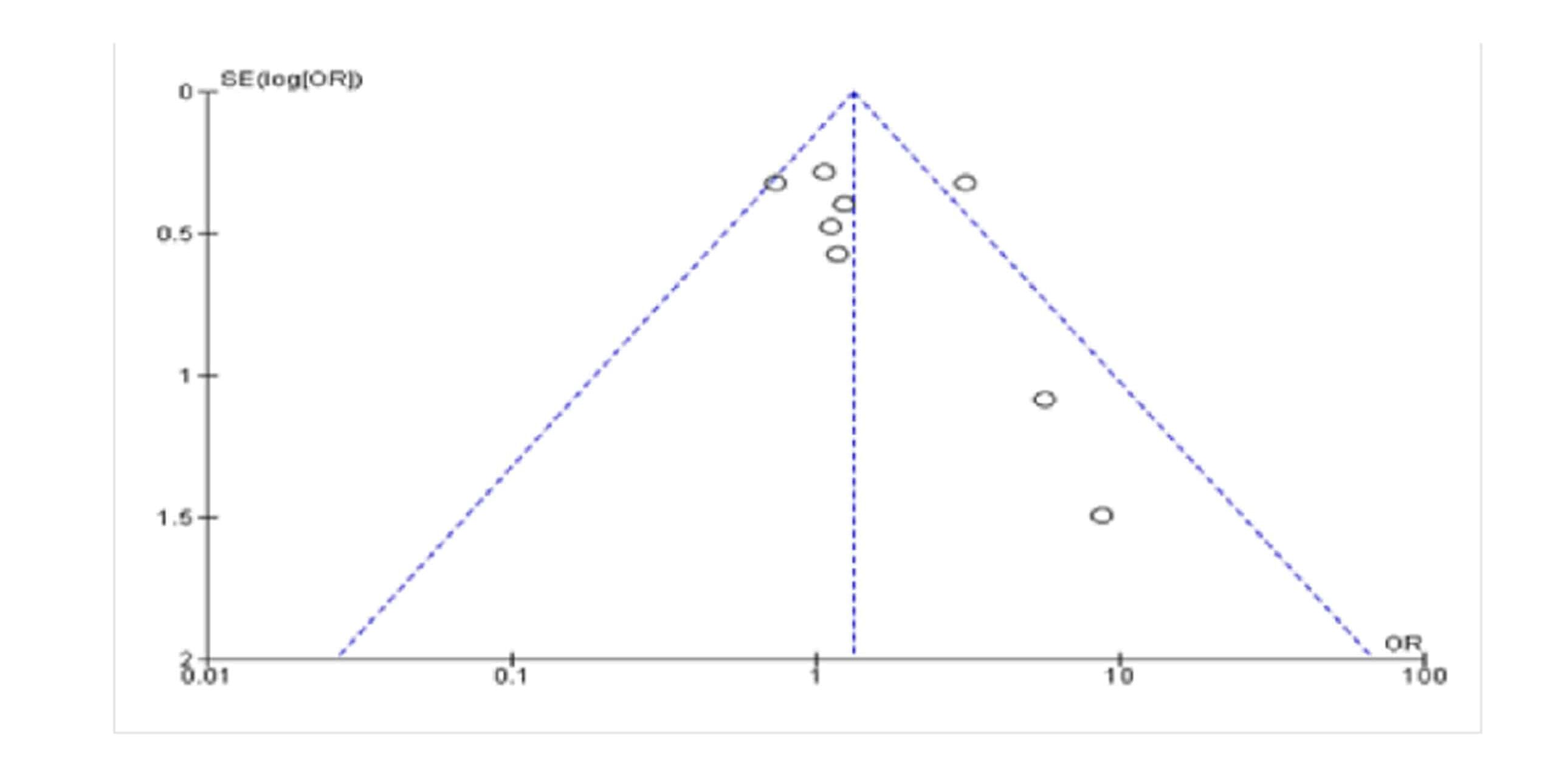 A funnel plot was constructed using Review Manager for assessment of the risk of bias in studies. There was a small publication bias found in the included studies as represented by the funnel plot shown below. The funnel plot shown (Figure 1) is asymmetrical as the studies are not evenly distributed on both sides of the plot.