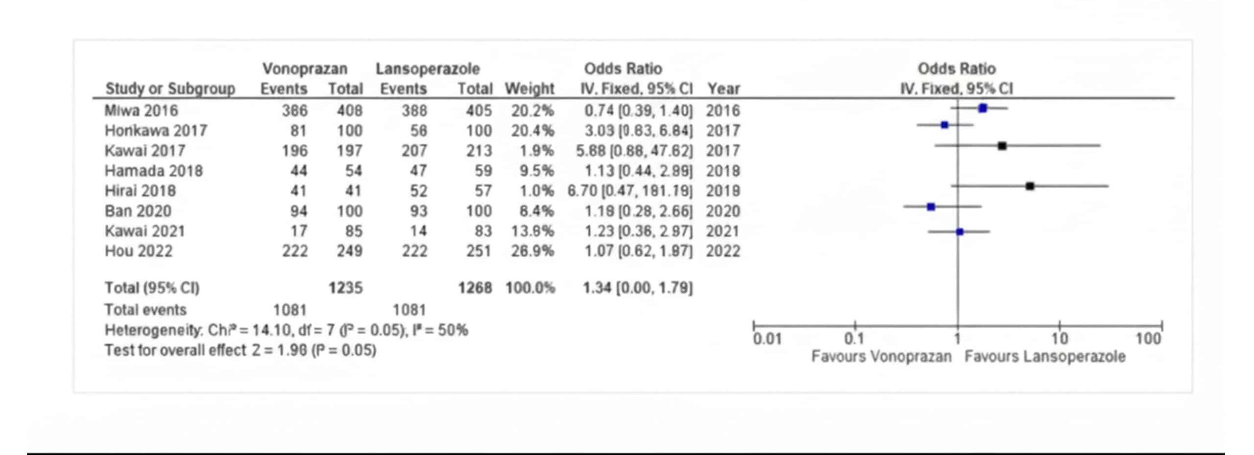 Ulcer healing rate/shrinkage ratio: The pooled odds ratio of Vonoprazan vs Lansoprazole for ulcer healing rate was 1.34 (95% CI,1.00-1.79, I2=50%), which was statistically significant with a p-value of 0.05 as shown in Figure 3.