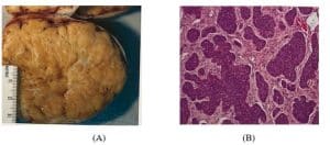 - Gross section of tumor reveals a firm, yellow, solid tumor that involves the entire ovarian parenchyma. This is somewhat smaller and more solid than is usually expected for this type of tumor